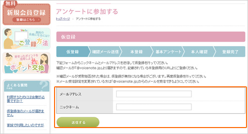 仮登録からメールアドレス、ニックネームを記入し送信して下さい。