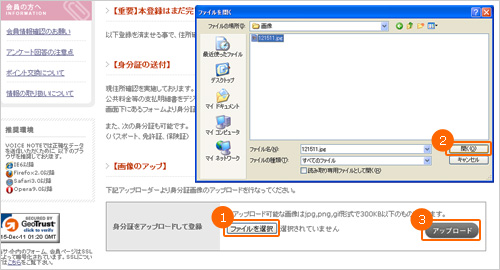図の①をクリックし選択画面を開きます。アップロードしたい画像を選択し、図②の「開く」ボタンをクリックします。