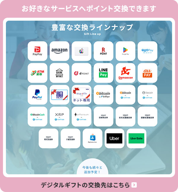 ※ポイント交換サイト「デジタルギフト」や姉妹サイト「コエタス」にポイントを移行することで交換が行えます。